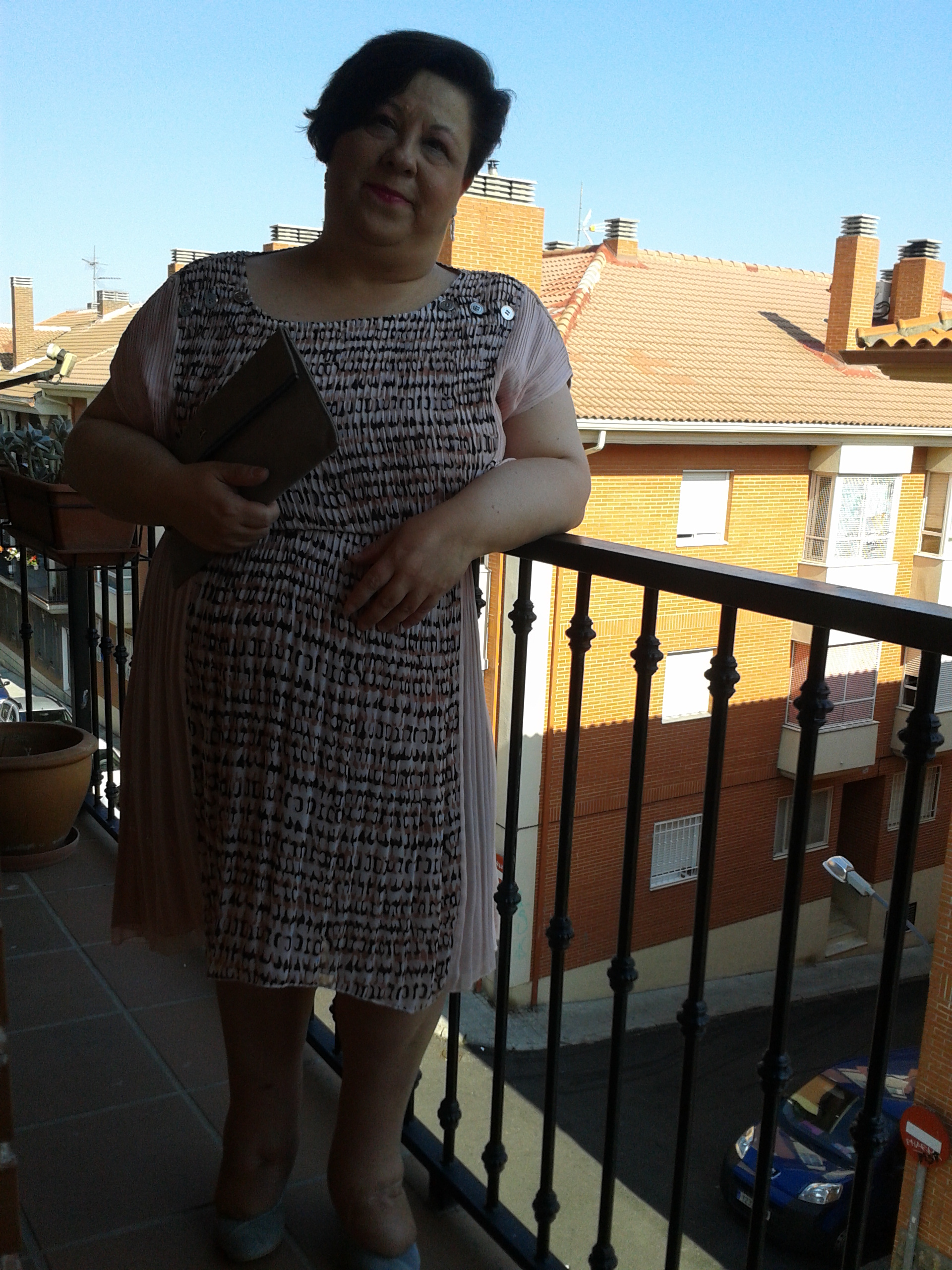 And now let´s tell in detail what I am wearing. It is too hot in Madrid nowadays so I decided to put on a Greek inspired dress. This pleated chiffon dress has nice buttons along the shoulders. The side panels are pale pink while the front and back have a small print in coral, grey and black. This type of dress can be dressed up or down. As I wanted a girly outfit I just added suede pumps and clutch as well as flower earrings in pale rose.