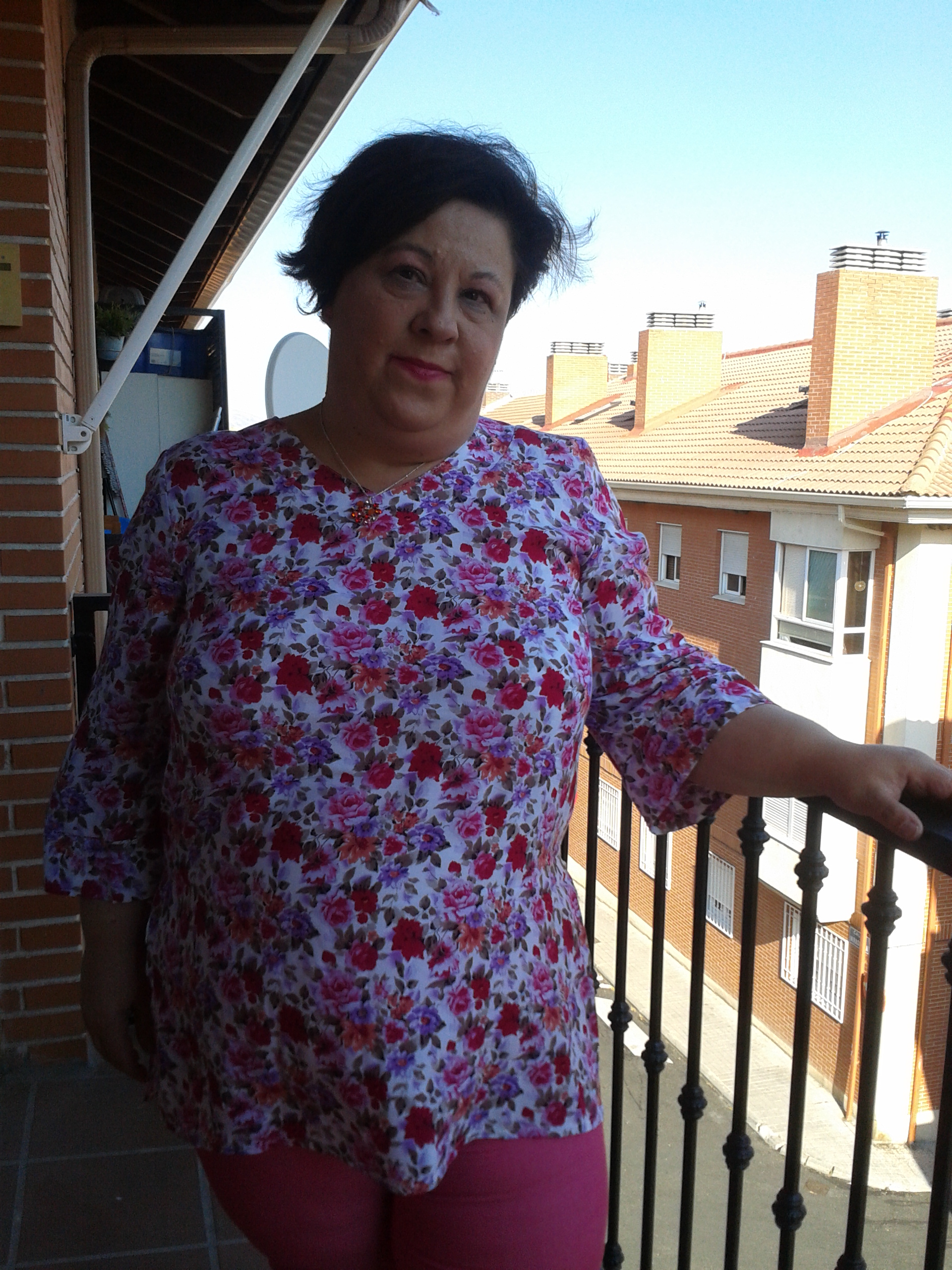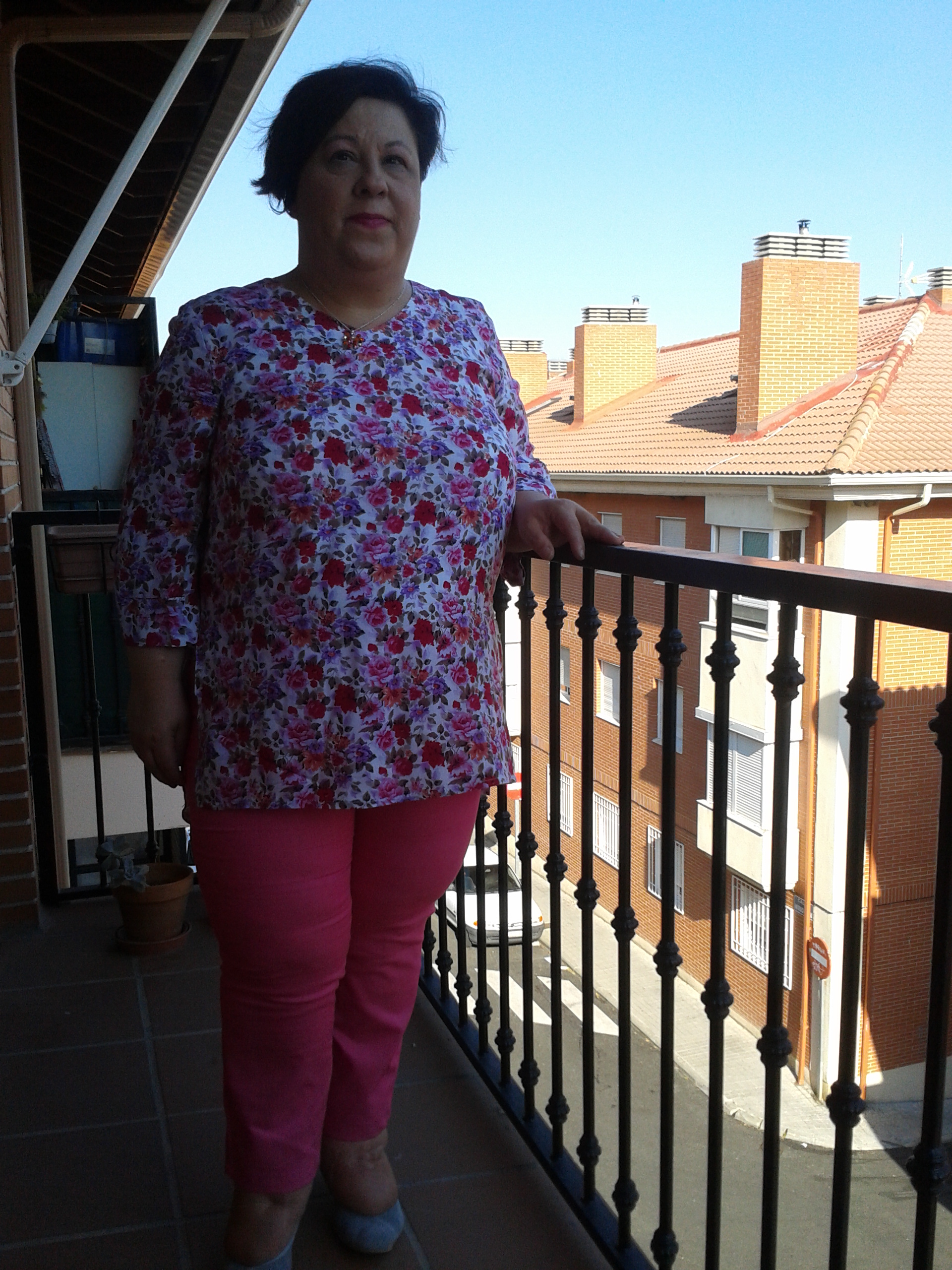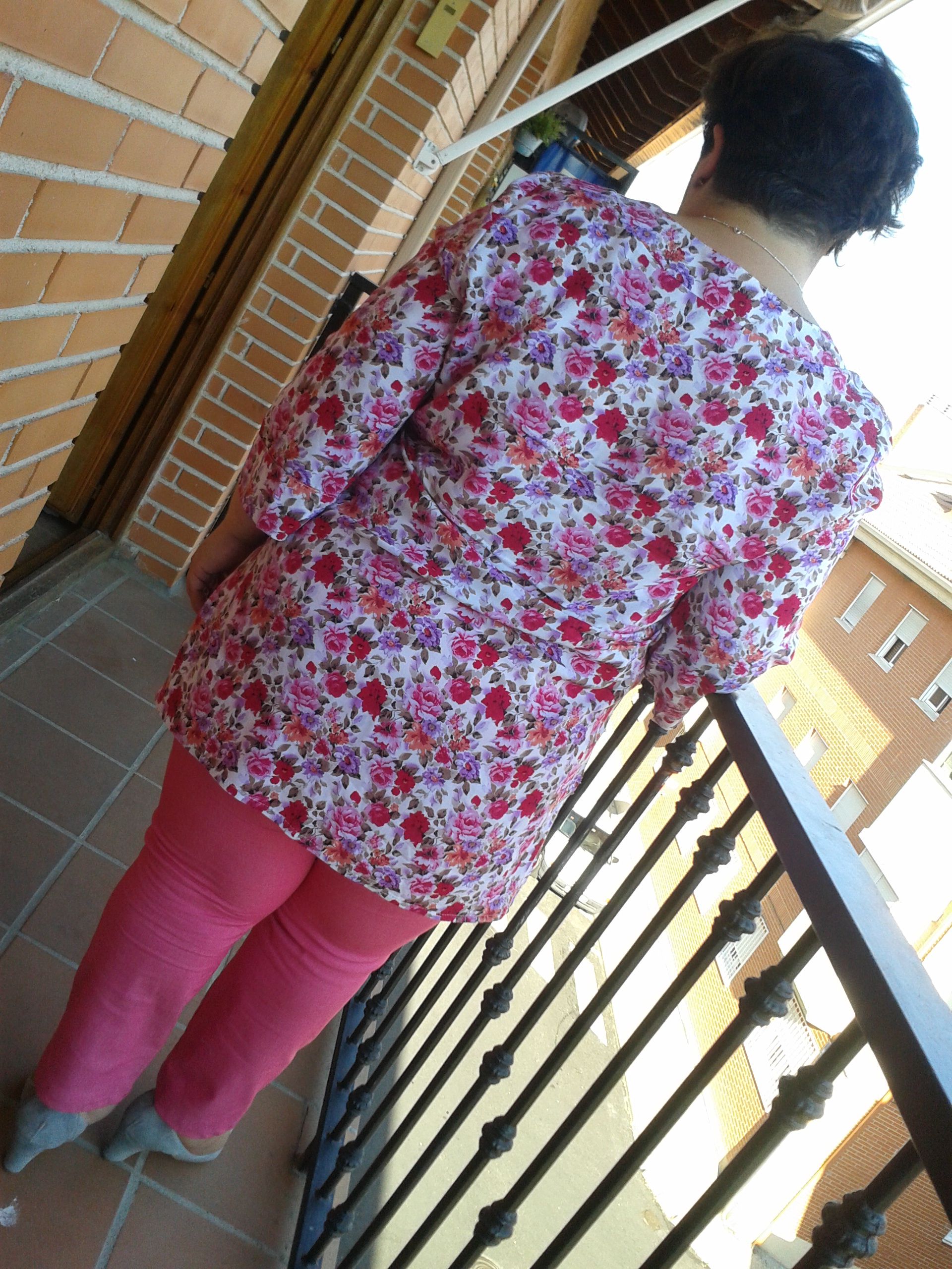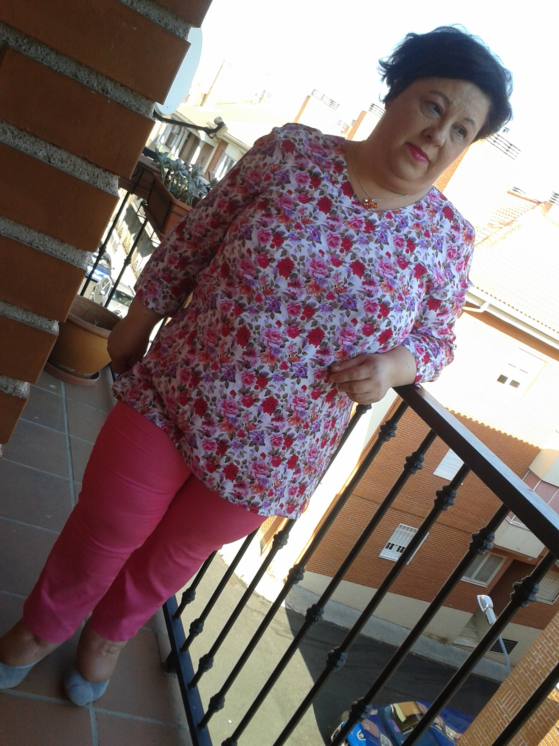Y otra vez toca rosa chicle. Sin embargo, esta vez se trata de algo muy informal. Unos jeans rosas… Y si me atrevo con ellos. Son bastante estrechos y eso me gusta. Los combino con una túnica llena de flores en tonos rosas, rojos y malvas que me encanta. Es muy sencilla pero el estampado es muy alegre y me anima mucho ya que mi piel es tan blanquita que estos colores me sientan bastante bien. Llevo unos zapatos de tacón medio en ante gris que estilizan un poco. Como accesorios un colgante en los tonos de la blusa y unos pendientes rosas en forma de dado que no han salido en las fotos bien. Hacía tanto calor que las hemos tenido que hacer en la terraza así que la calidad no es la mejor. Las próximas espero que ya sean buenas.