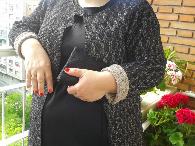 Another concert, another black outfit. But this is the last for the season. And yes, I do adore black it is flattering and smart. Elegance at glance, instantly. Then why not abusing on black outfits for formal looks? But something new today, gold accents in a crinkle coat by Adolfo Dominguez. The black dress is from HM maternity, my refuge for long time when in Spain nothing decent could be found for plus size women. So I still keep the routine of checking what is new in maternity sections or shops … for sure you always find something interesting there.